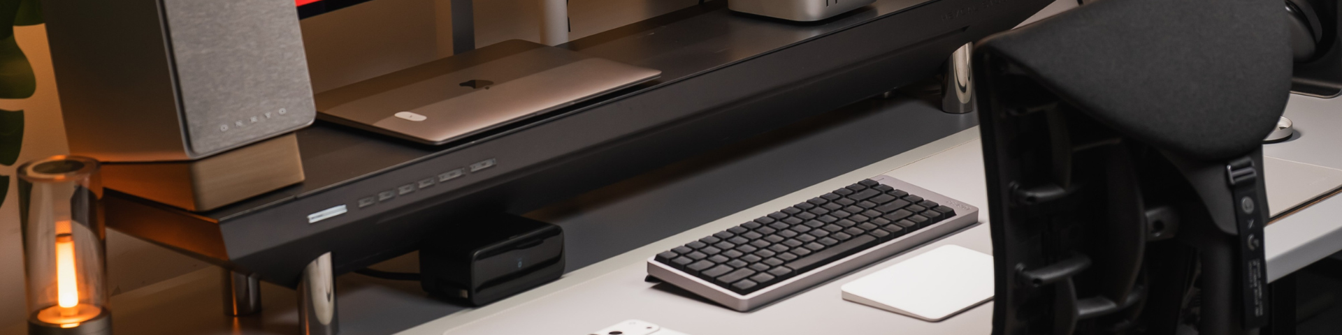 With cables managed and monitors properly aligned, the desk surface itself becomes an important part of the overall experience. Multi-monitor setups work best when the desktop remains open and intentional. Keeping only your essential tools — keyboard, mouse, input devices — helps maintain a sense of clarity and supports your workflow without adding unnecessary visual noise.Hexcal Studio™ enhances this by combining elevation, cable concealment, and subtle integrated storage beneath its surface. By hiding your power system and routing cables internally, Studio keeps the desktop clear without requiring extra accessories. This ensures your monitors remain the visual centerpiece while your workspace stays efficient and distraction-free.