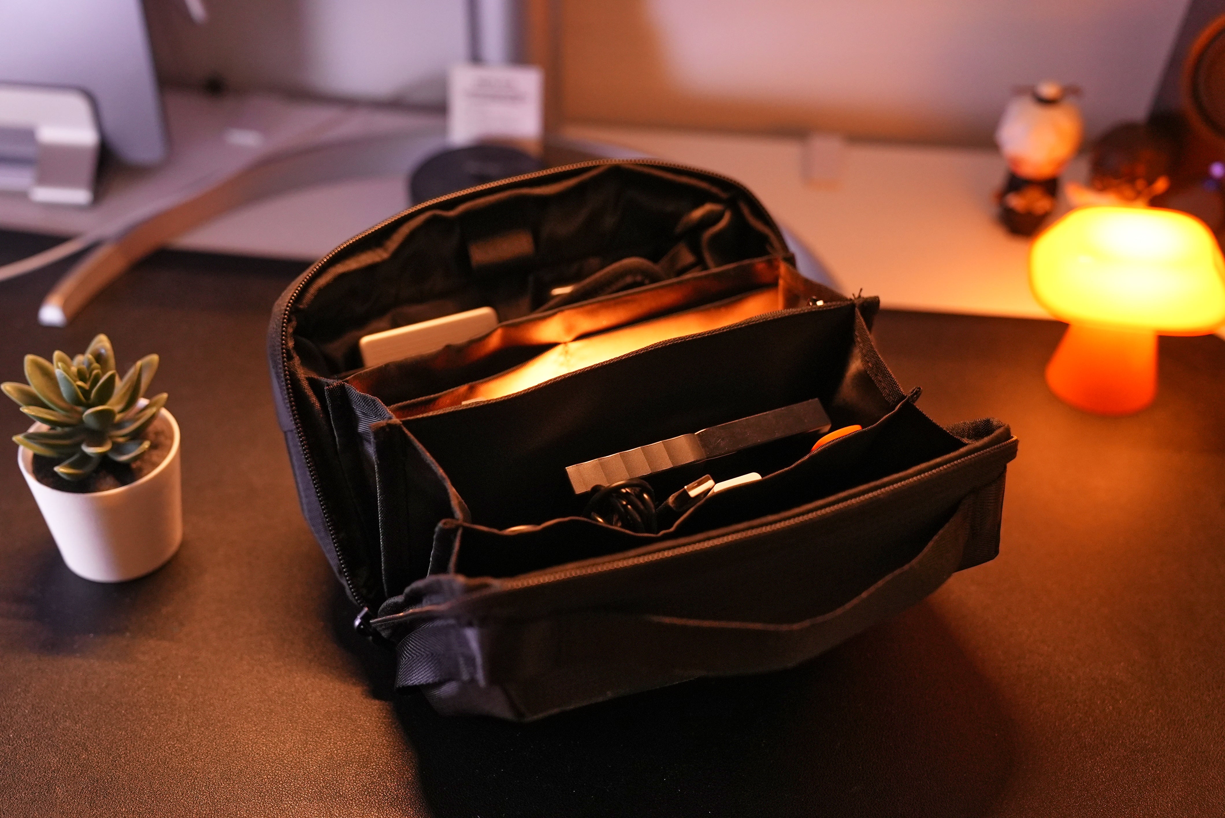 The Tech Pouch is designed for unparalleled organization and accessibility, whether you're commuting, traveling, or just keeping your workspace tidy. Its origami-style pockets maximize space, allowing you to neatly store cables, EDC gear, and travel essentials.