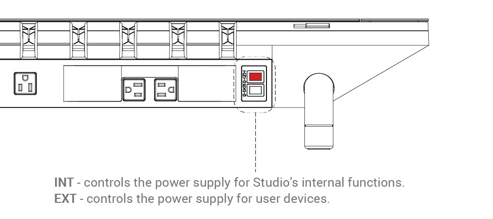 Step 1: Find the UPPER power button on the back side of the Studio and press it once to turn off the internal function of the machine. (The INT button controls the internal power supply. It should be on your left hand side when the machine's front side faces you. DO NOT press the LOWER button as it will cut off power to the Studio.)